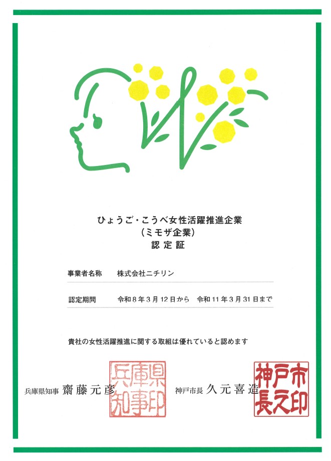「ひょうご・こうべ女性活躍推進企業認定(ミモザ企業認定)」に認定されました。
