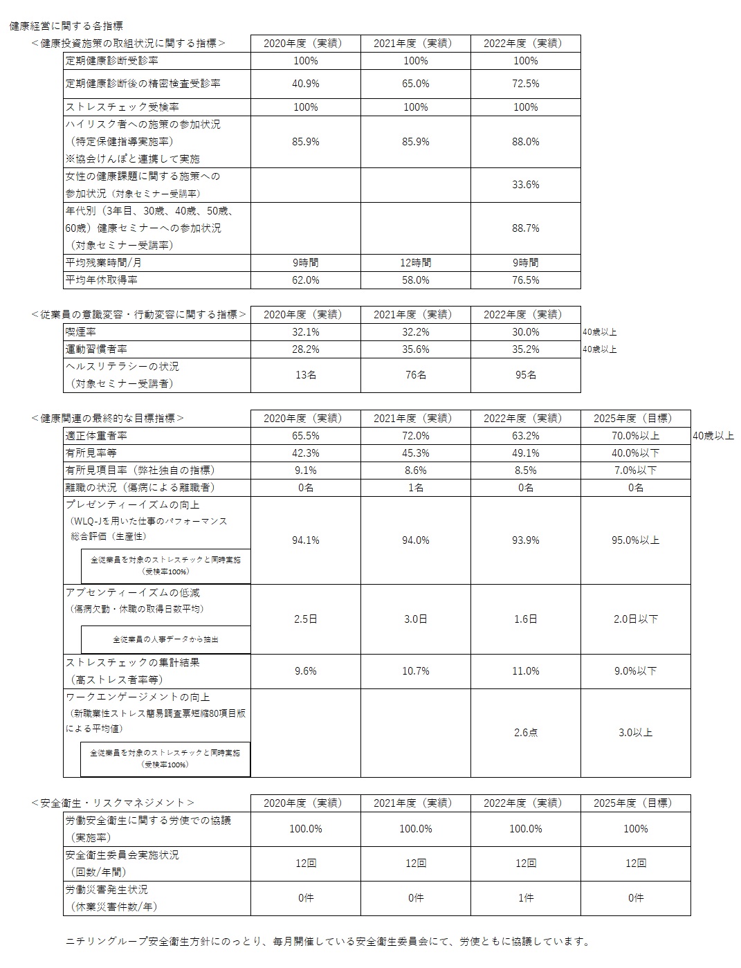 ニチリングループ安全衛生方針にのっとり、毎月開催している安全衛生委員会にて、労使ともに協議しています。